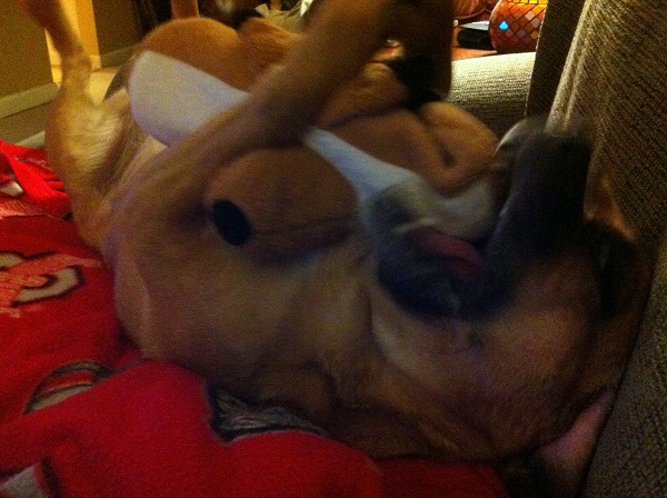My workouts were definitely cut short this week with a bout of the 12 hour flu Wednesday night/Thursday. Being sick on Thursday meant no spinning or other workout at lunch, and no yoga after work. Oh well….I’m just grateful that it was such a short flu and no stomach issues. I’ve heard of a lot of people that have it for 10 days or more with lots of gross stuff! Boof loved having me home today because Loren had her get in bed with me when he left for work and she loves when she gets the change to sleep in our bed. She also did a lot of playing beside me on the couch instead of sleeping the day away like she does when we are at work. She’s also been loving a new toy that our friends brought for her.