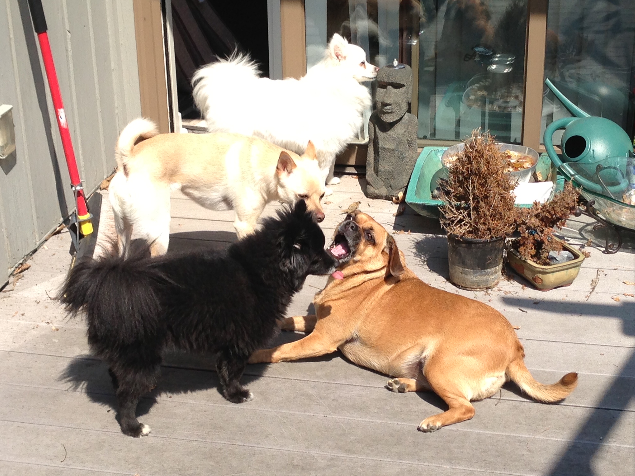 - Noon – Nothing: I needed a nap, so I took a nap. We had a baby care class that night from 6-9 p.m., so I knew I could benefit from some rest. Boofie got to spend some time with her friends while we were gone today…this isn’t from today, but I love this pic of all of them. Boof looks like a beached seal, but she’s slimmed down a bit since then.
